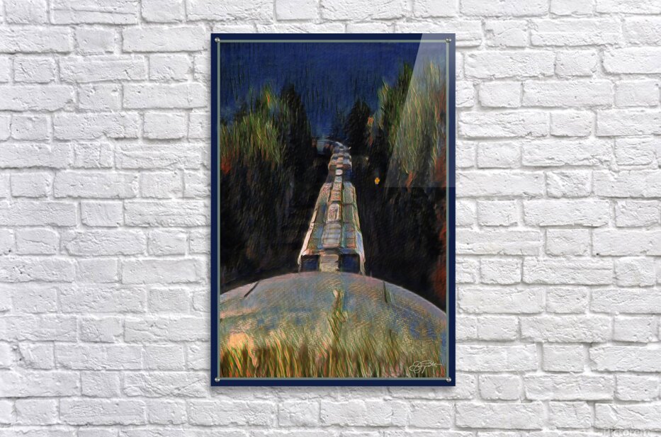 I was crossing a bridge over the CPR railway when I noticed a freight train approaching the bridge. The light, also minimal, seemed suitable for a picture if I could get up. No cars were coming, so I leapt out of the car, camera in hand, and took this picture of the top of the box cars speeding through the night and around a bend in the rail line. It felt right that I develop the image in an impressionistic style.
