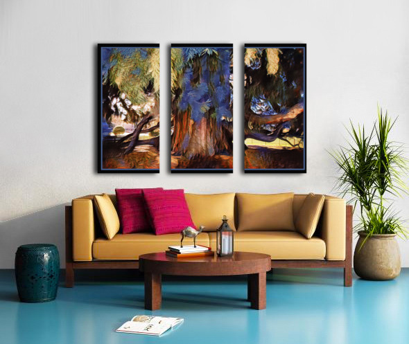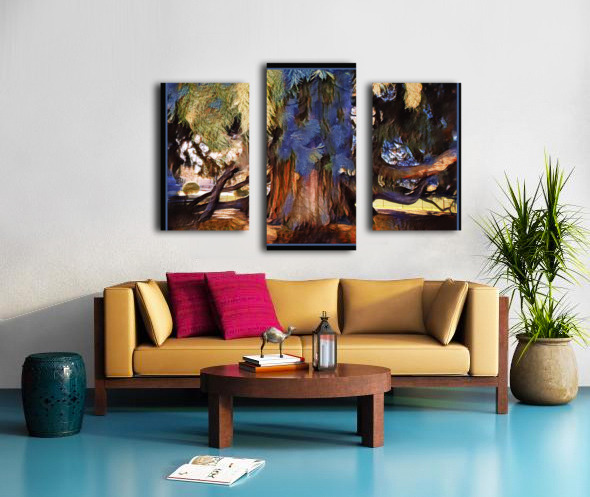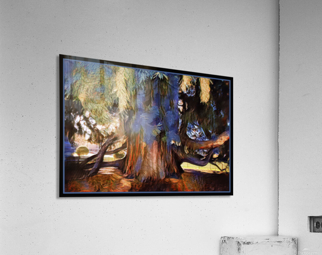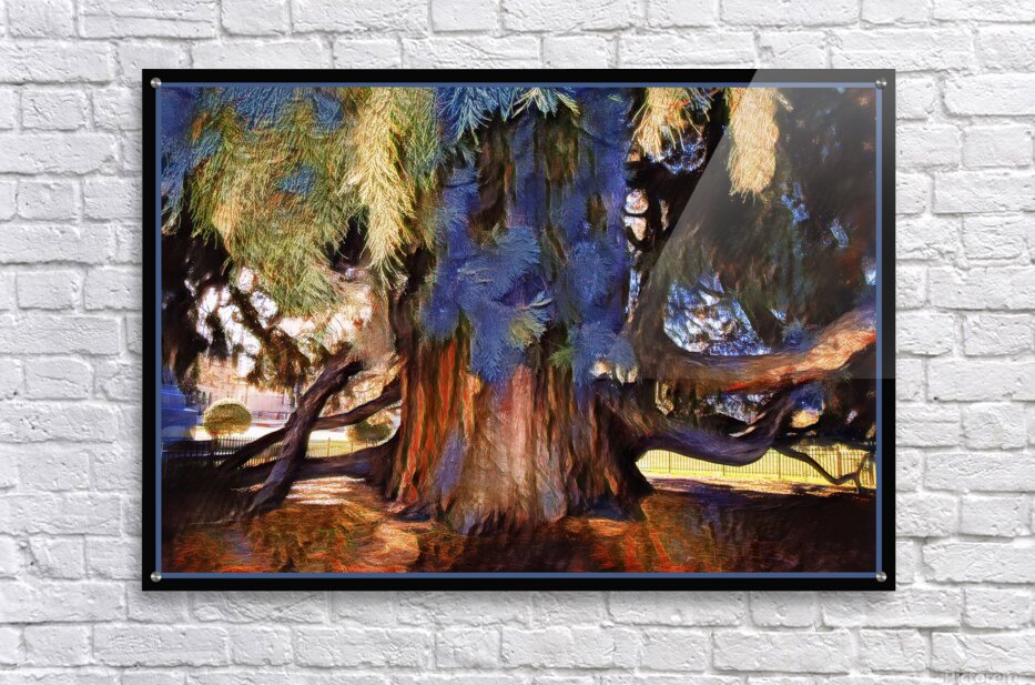 This giant sequoia is found on the grounds of the Victoria B.C. government buildings. Impressionism celebrates the unusual blues and striking reds of the bark and the branches reflecting the blues of nearby plants and statues.