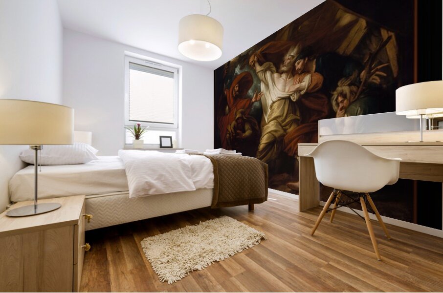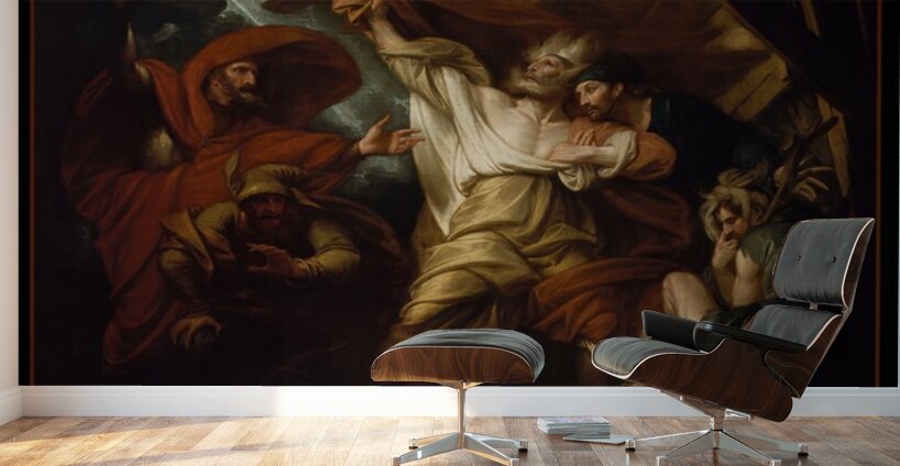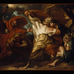 Benjamin West's King Lear Act III scene 4: This 1788 oil on canvas depicts a chaotic scene where a deranged Lear is tearing off his clothes, suppo...[+]